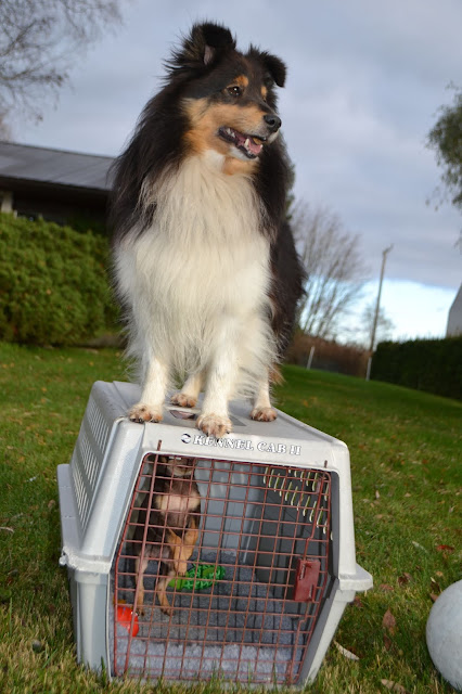 Tässä tapahtui työtapaturma, että Retro hyppäsi kuljetuskopan päälle. Se on opetettu hyppäämään huonekalujen ym päälle noseworkin hommia varten ja nyt kun olin kopan vieressä kyykyssä, Retro hyppäsi. Kesä ei näyttänyt olevan moksiskaan, joten kuvattiin tilanne sitten.